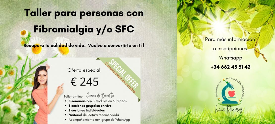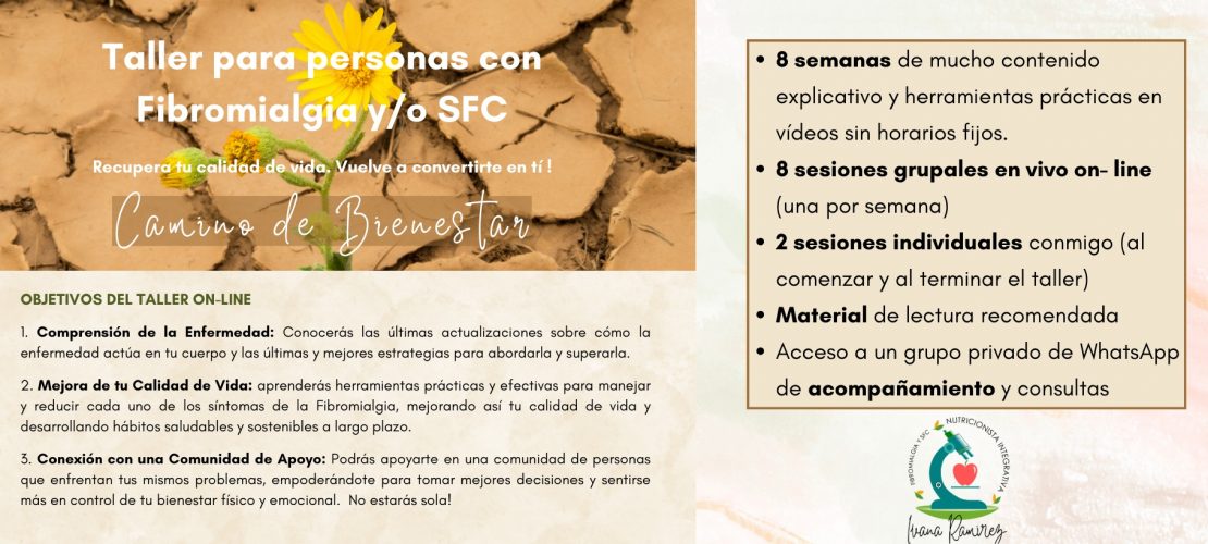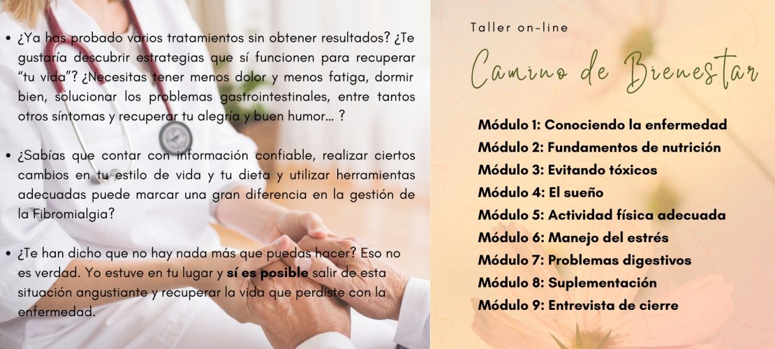 Leer más »Taller Camino de Bienestar Taller para personas conFibromialgia y/o SFCRecupera tu calidad de vida. Vuelve a convertirte en tí ! No estarás sola,permíteme llevarte de la mano. Camino de Bienestar OBJETIVOS ...